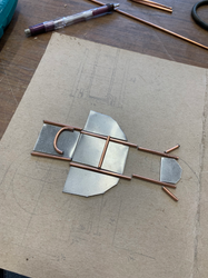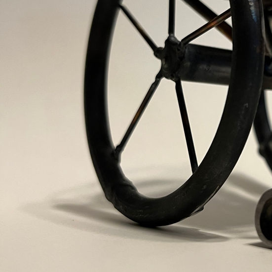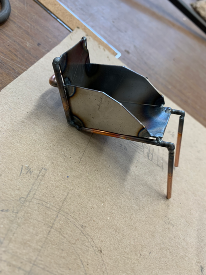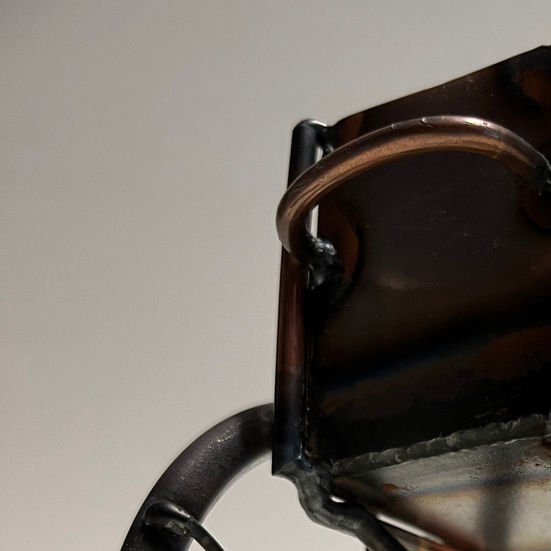 This is another one of my earliest metal sculptures I created. This project was the result of my first time TIG welding! The prompt of this project had to do with transportation. I took it literally as I was inspired by my own personal wheelchair, considering it is my main mode of transportation. I used nuts for the casters and steel sheet pieces & copper-coated filler rods for the frame. It was a very slow and meticulous process due to the size of the parts I was working with, but it was definitely fun !